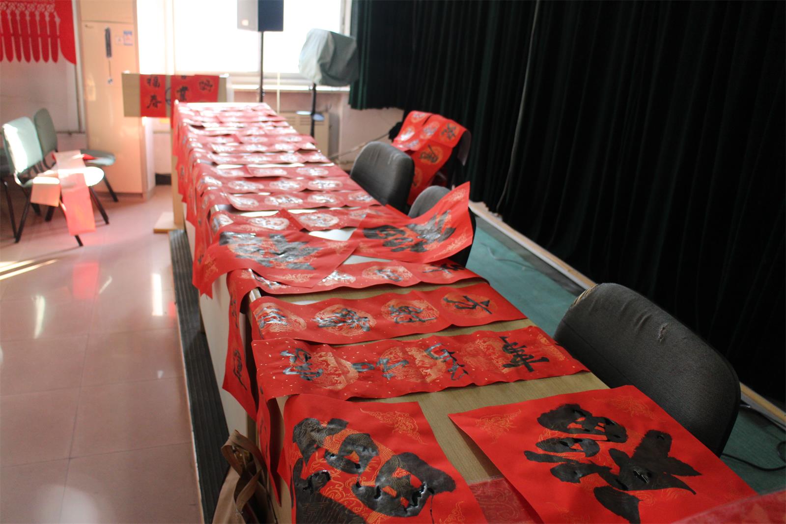 今年當然也不能例外!22 日下午15 點至 17 30分,市書法家協(xié)會的多位優(yōu)秀書法家準時來到五樓會議室為本院職工們免費書寫春聯(lián),大伙兒熱情很高, 現(xiàn)場氣氛歡快,不一會兒各色字體,不同內(nèi)容的大紅春聯(lián)就鋪滿了各個角落。